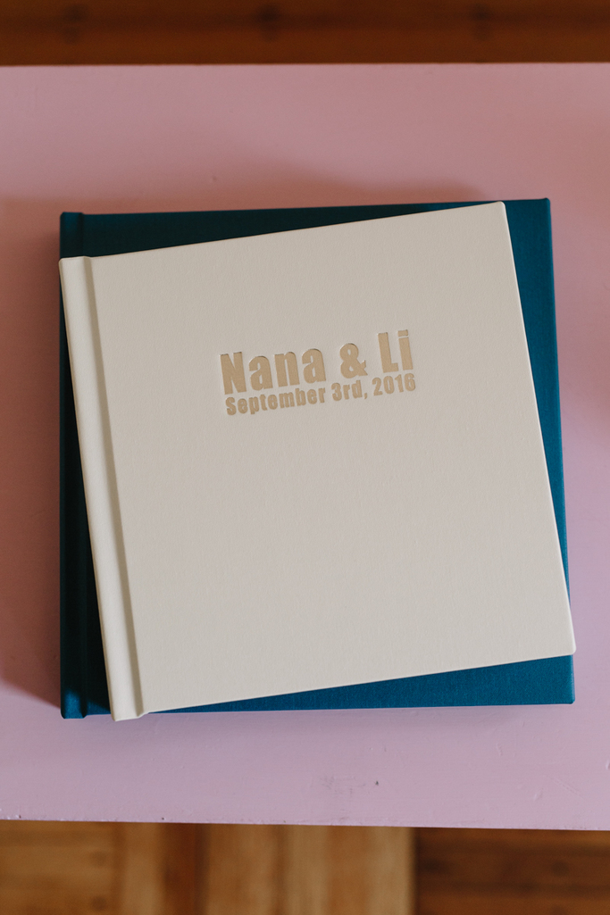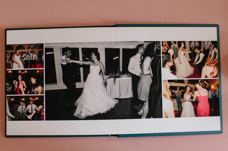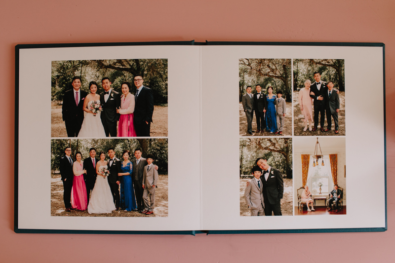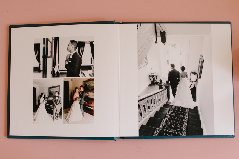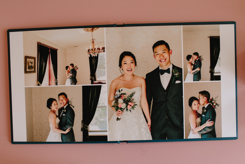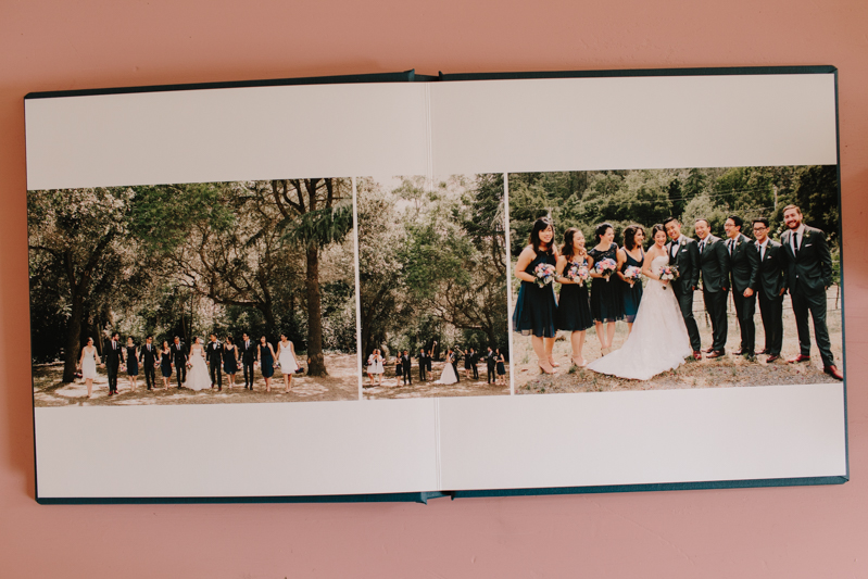 If you remember Rachel and David’s beautiful Elliston Vineyards Wedding, you’ll love seeing their wedding photo album. It was a 10×10 album with 29 spreads on beautiful layflat pages. The cover was Blue Jelly Bean with a Rose Gold Deboss on the front. You can see it below against an 8×8 album (Nana and Li’s 8×8 album here) for size reference. Love this one!